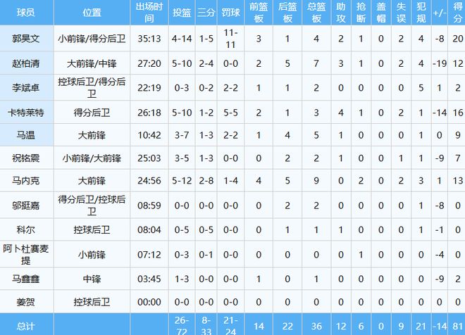最终同曦队主场81-95不敌广州队,郭昊文空砍20分4板2助1断。