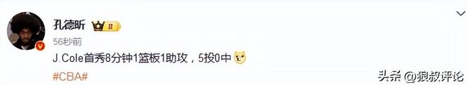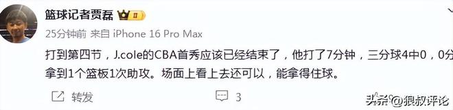 篮球记者贾磊发文点评说道:打到第四节,J.cole的CBA首秀应该已经结束了,他打了7分钟,三分球4中0,0分拿到1个篮板1次助攻。场面上看上去还可以,能拿得住球。