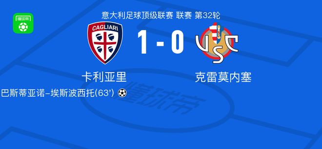 北京时间4月11日意大利足球顶级联赛第32轮,卡利亚里主场迎战克雷莫内塞。比赛中,卡利亚里球员塞巴斯蒂亚诺-埃斯波西托攻入制胜球。最终比分定格为卡利亚里1-0克雷莫内塞。精彩瞬间第63分钟,卡利亚里球员泽-佩德罗助攻塞巴斯蒂亚诺-埃斯波西托打入一球。球队阵容技术统计
