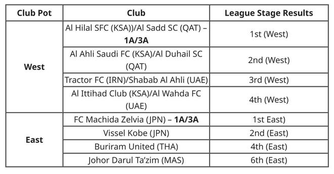 球队将按地区分为东西两组,组内排名最高的球队将根据联赛阶段成绩确定。在西区球队尚未确定的情况下,将设立占位符,并按对应对阵中排名更高的球队联赛阶段成绩进行排序;在东区,日本的町田泽维亚为东区头号种子,具体如下: